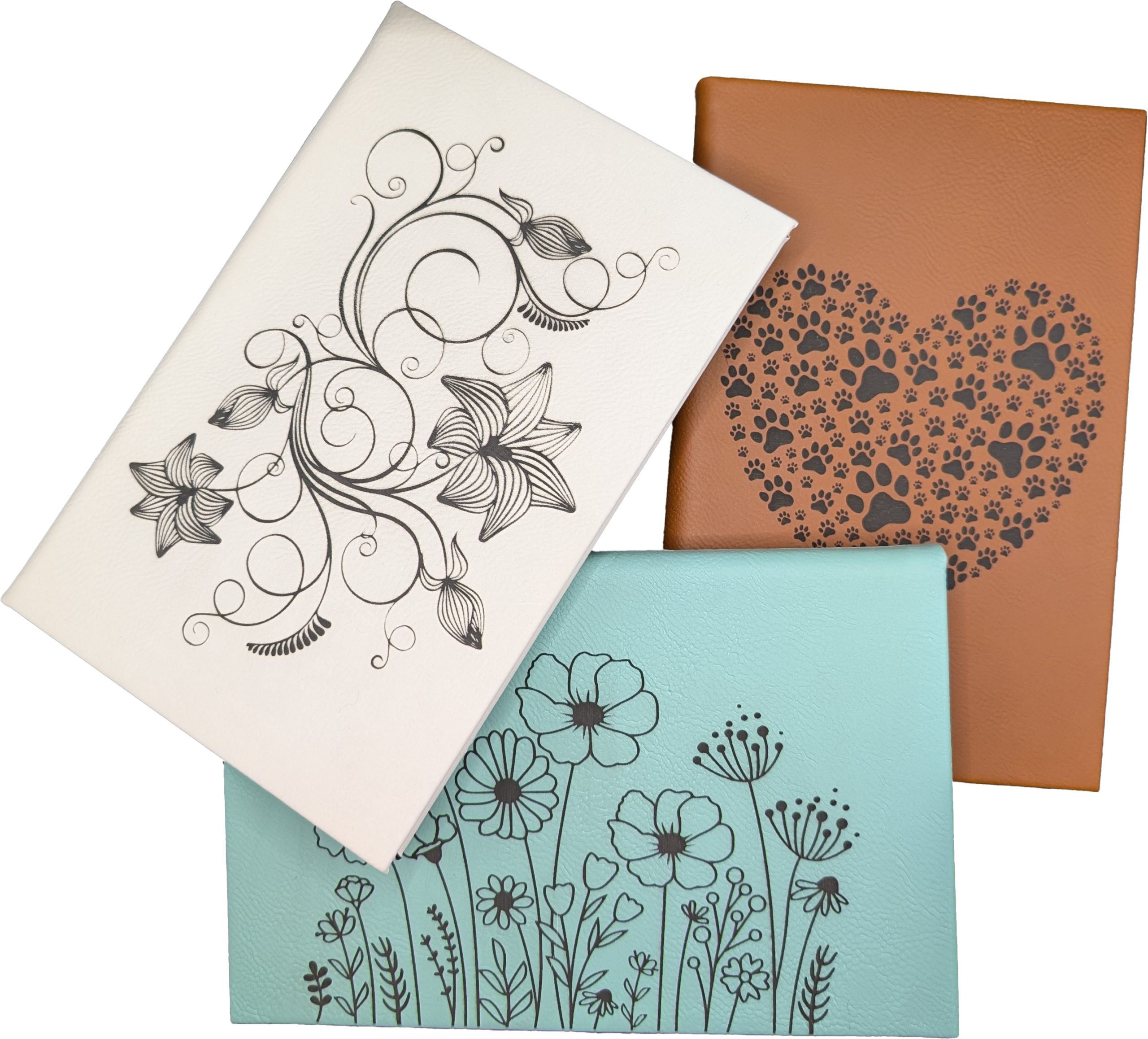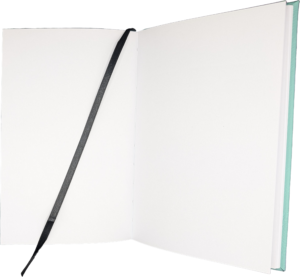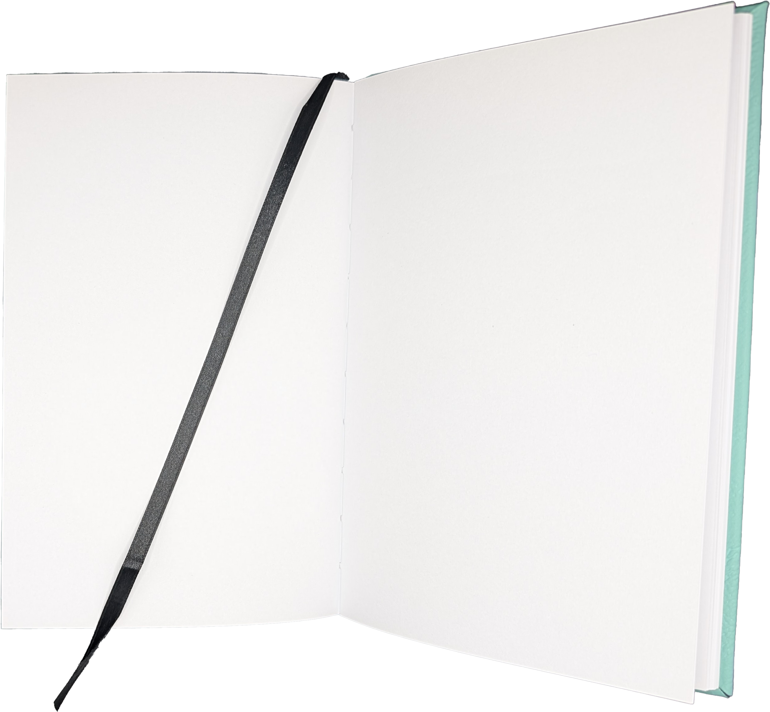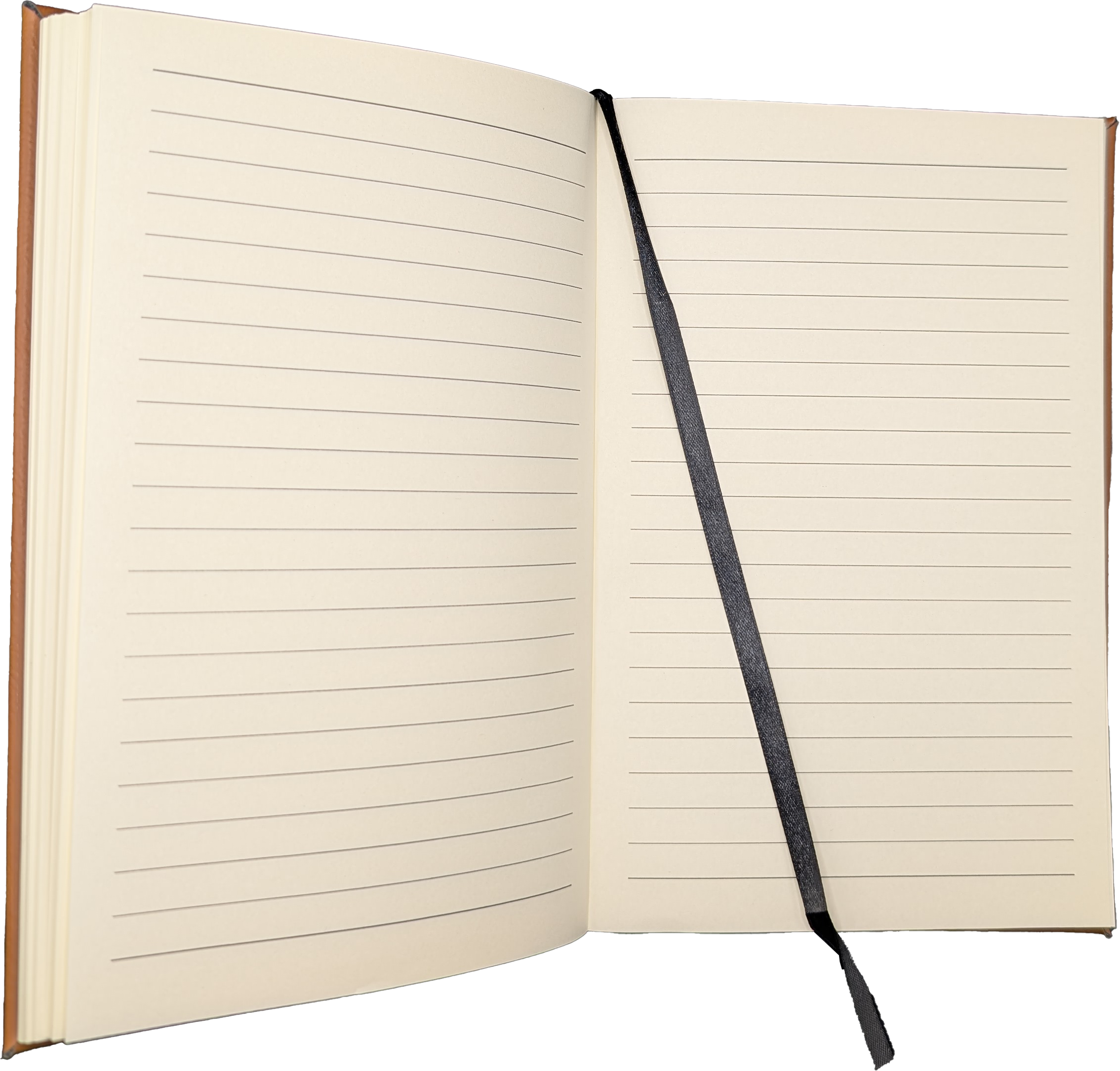 Leather bound notebook with a black satin ribbon bookmark. Notebooks are 5 1/4 inches wide and 8 1/4 inches tall with 112 pages.